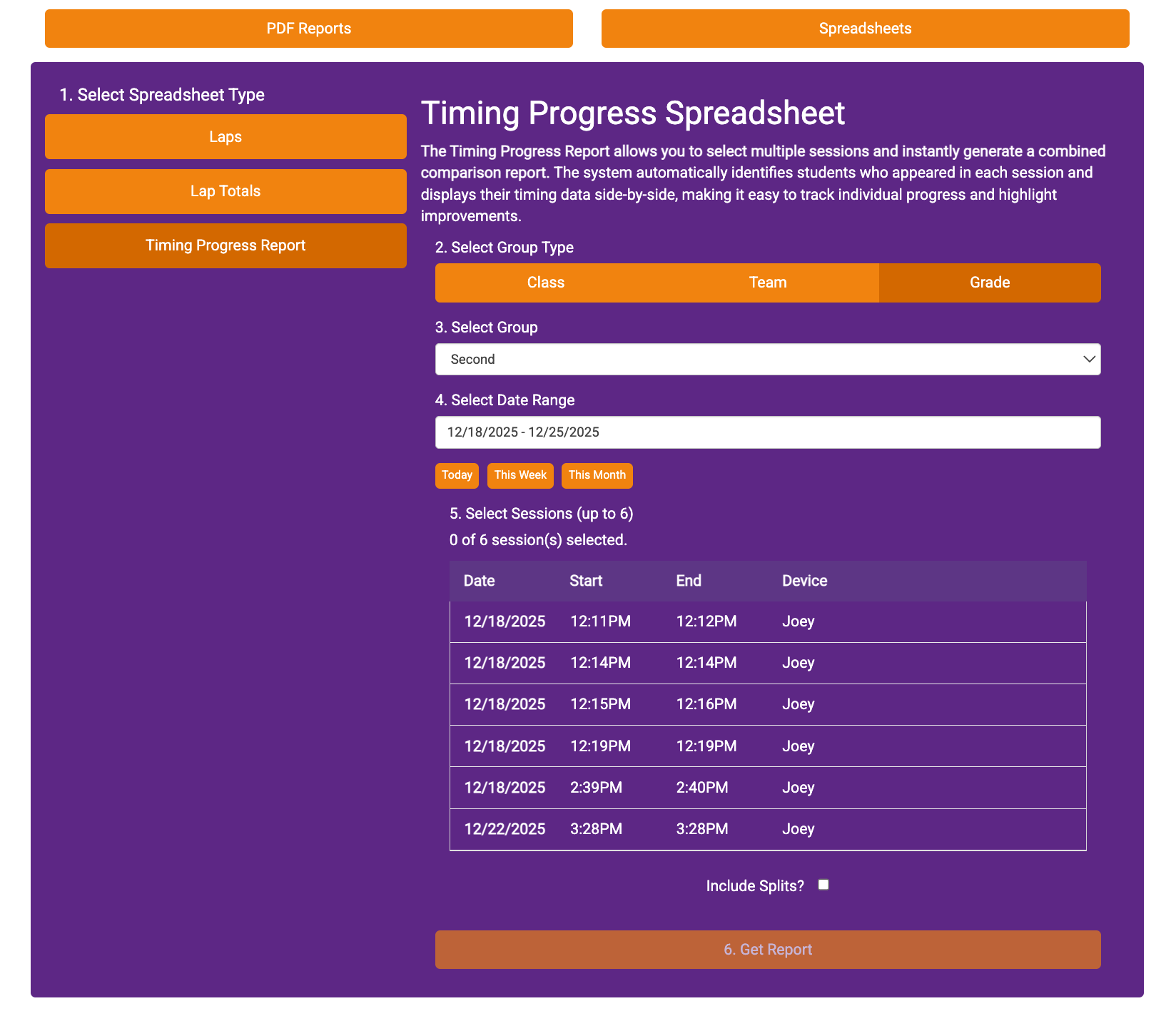 The Timing Progress Report allows you to select multiple sessions and instantly generate a combined comparison report. The system automatically identifies students who appeared in each session and displays their timing data side-by-side, making it easy to track individual progress and highlight improvements.